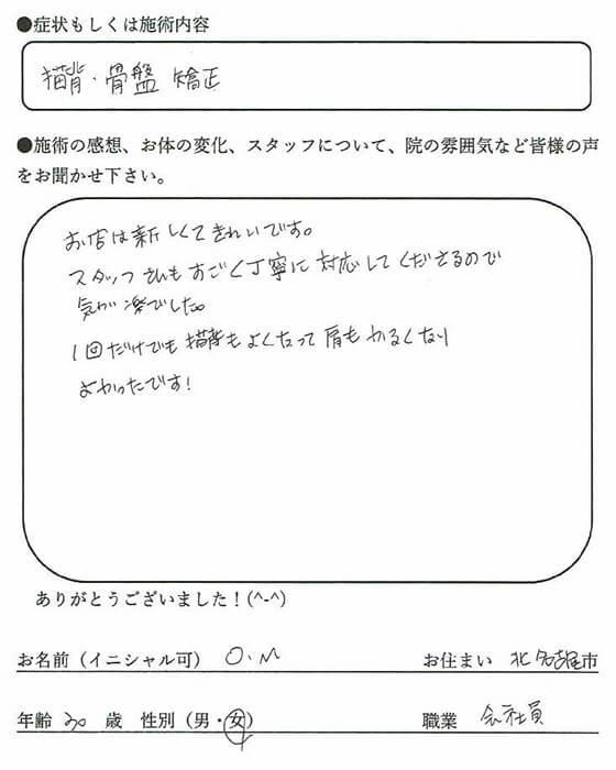 1回だけでも猫背もよくなって肩もかるくなりよかったです!※患者様個人の感想であり、効果・効能を保証するものではありません。